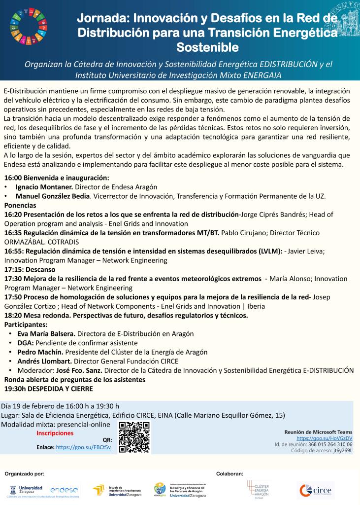 En el actual escenario de emergencia climática, la descarbonización del sistema energético se ha convertido en una prioridad estratégica a nivel europeo y nacional. En este contexto, la Cátedra de Innovación y Sostenibilidad Energética EDISTRIBUCIÓN, junto al Instituto Universitario de Investigación Mixto ENERGAIA, organizan esta jornada técnica en la Universidad de Zaragoza para analizar el papel crítico de las redes de distribución como columna vertebral de la transición energética.